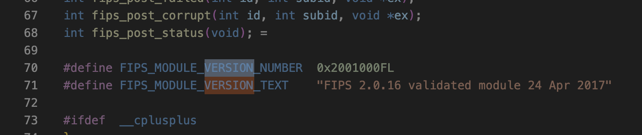 FIPS 모듈의 버전을 명시하는 헤더를 찾았는데 아까 위에서 확인한 버전 체계와 그렇게 유사한지는 모르겠지만 0x2001000FL 이라는 버전을 명시하고 있다.