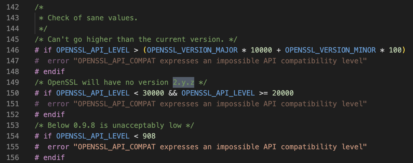 우선 Configure 파일과 macros.h 파일을 찾아보면 OpenSSL 자체를 빌드할 땐 메이저 버전 2 를 배제함을 확인할 수 있다.